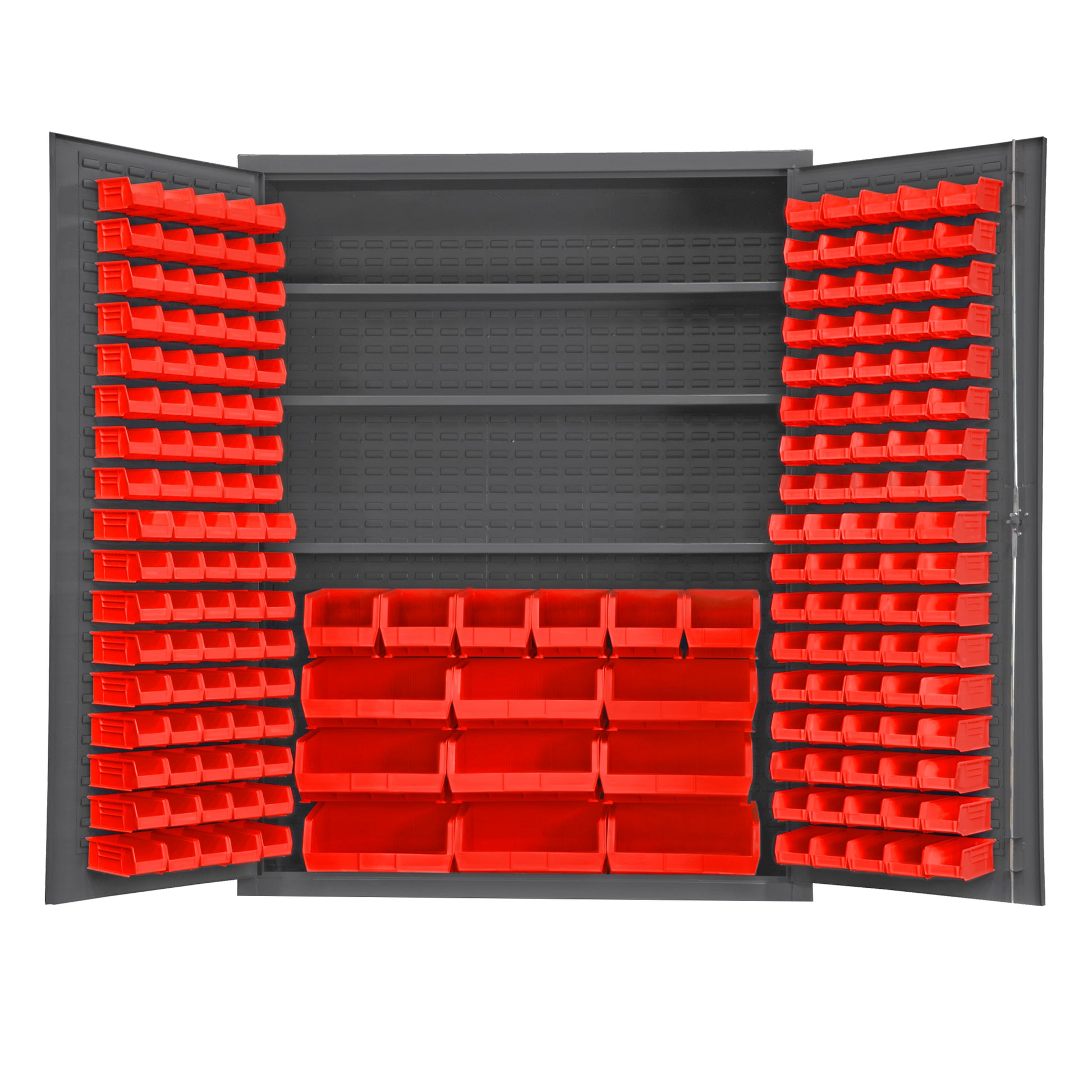 Heavy Duty Cabinet, 14 Gauge, 60 x 24 x 78, 3 Adjustable Shelves, 185 Red Bins, Flush Doors with Louvered Panel, Cast Iron Pad-lockable Handle, Gray