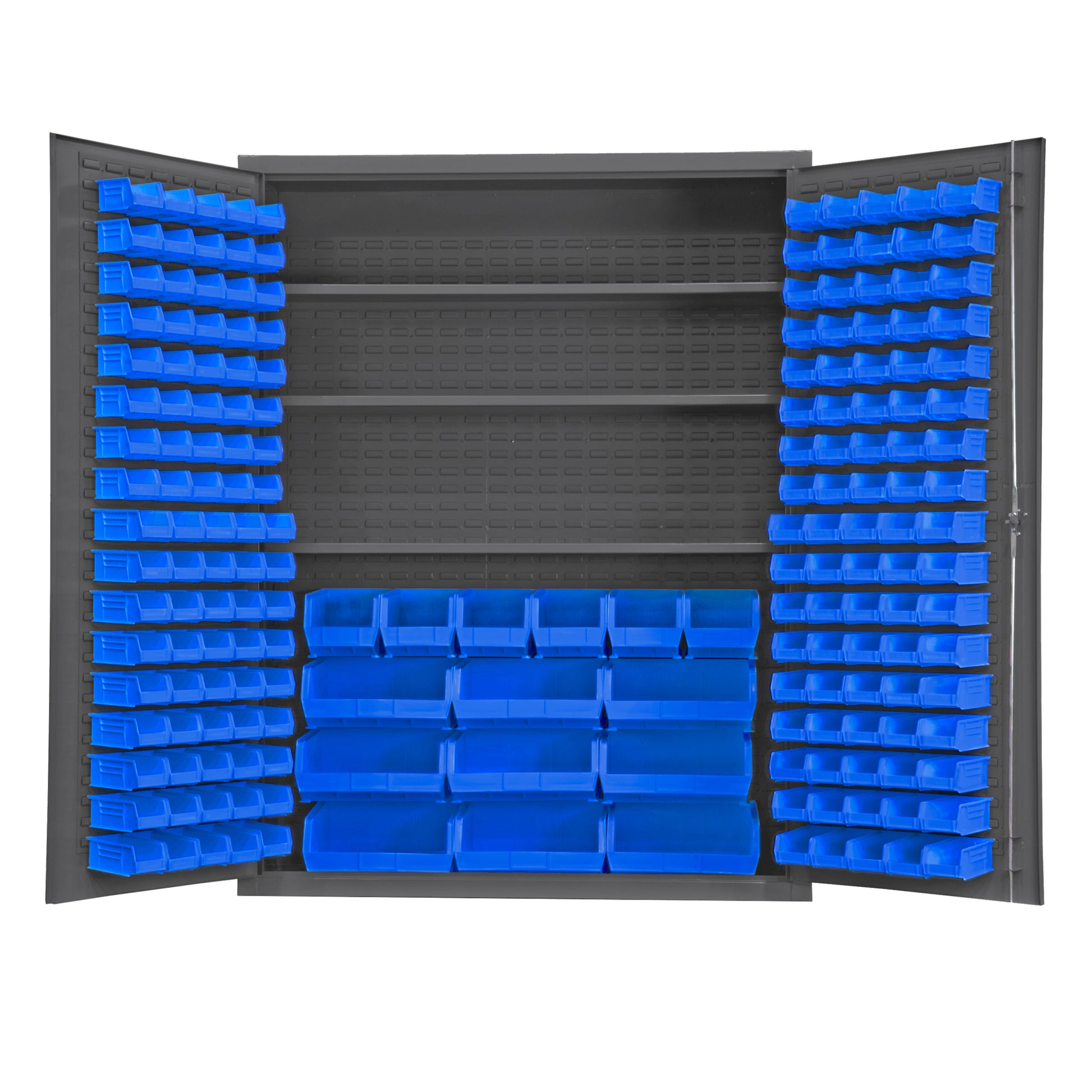Heavy Duty Cabinet, 14 Gauge, 60 x 24 x 78, 3 Adjustable Shelves, 185 Blue Bins, Flush Doors with Louvered Panel, Cast Iron Pad-lockable Handle, Gray