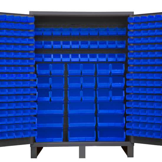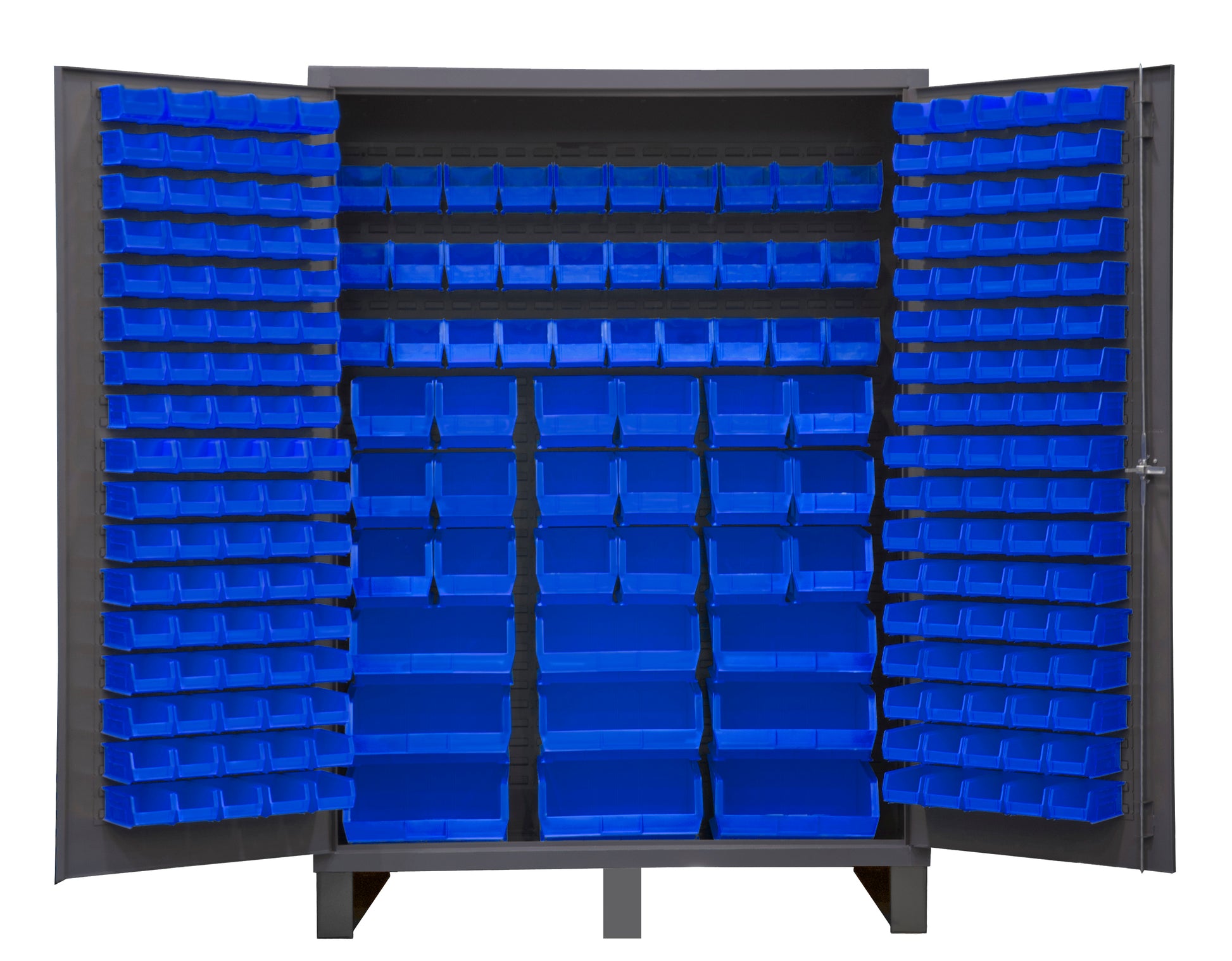 Heavy Duty Cabinet, 14 Gauge, 60 x 24 x 84, 227 Blue Bins, Flush Doors with Louvered Panel, Cast Iron Pad-lockable Handle, Gray