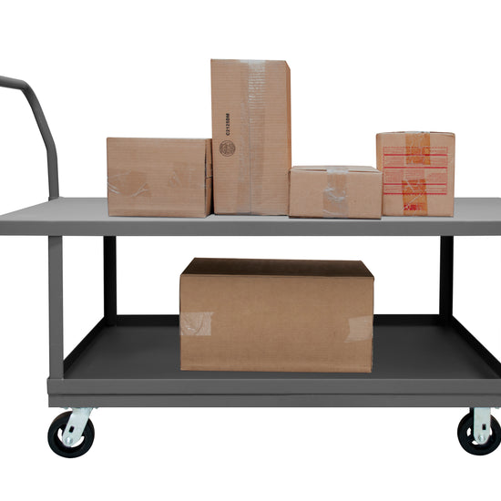 Platform Truck, Work Height, 12 Gauge, 2000 lbs Capacity, 2 Shelves, 30 x 60, Lipped/Flush Combination Shelves, 5" x 2" Mold-On Rubber Casters - (2) Rigid, (2) Swivel, Gray