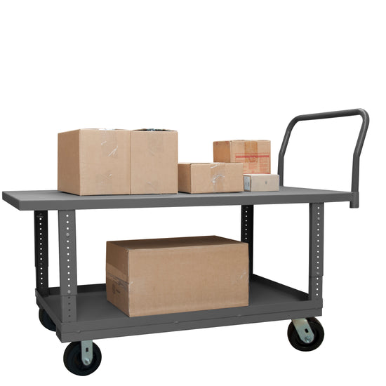 Platform Truck, Adjustable Work Height, 12 Gauge, 2000 lbs Capacity, 2 Shelves, 30 x 60, Lipped/Flush Combination Shelves, 5" x 2" Phenolic Casters - (2) Rigid, (2) Swivel, Gray