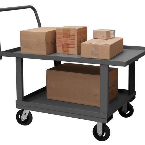 Platform Truck, Work Height, 12 Gauge, 2000 lbs Capacity, 2 Shelves, 24 x 60, Lipped Deck, 6" x 2" Mold-On Rubber Casters - (2) Rigid, (2) Swivel, Gray